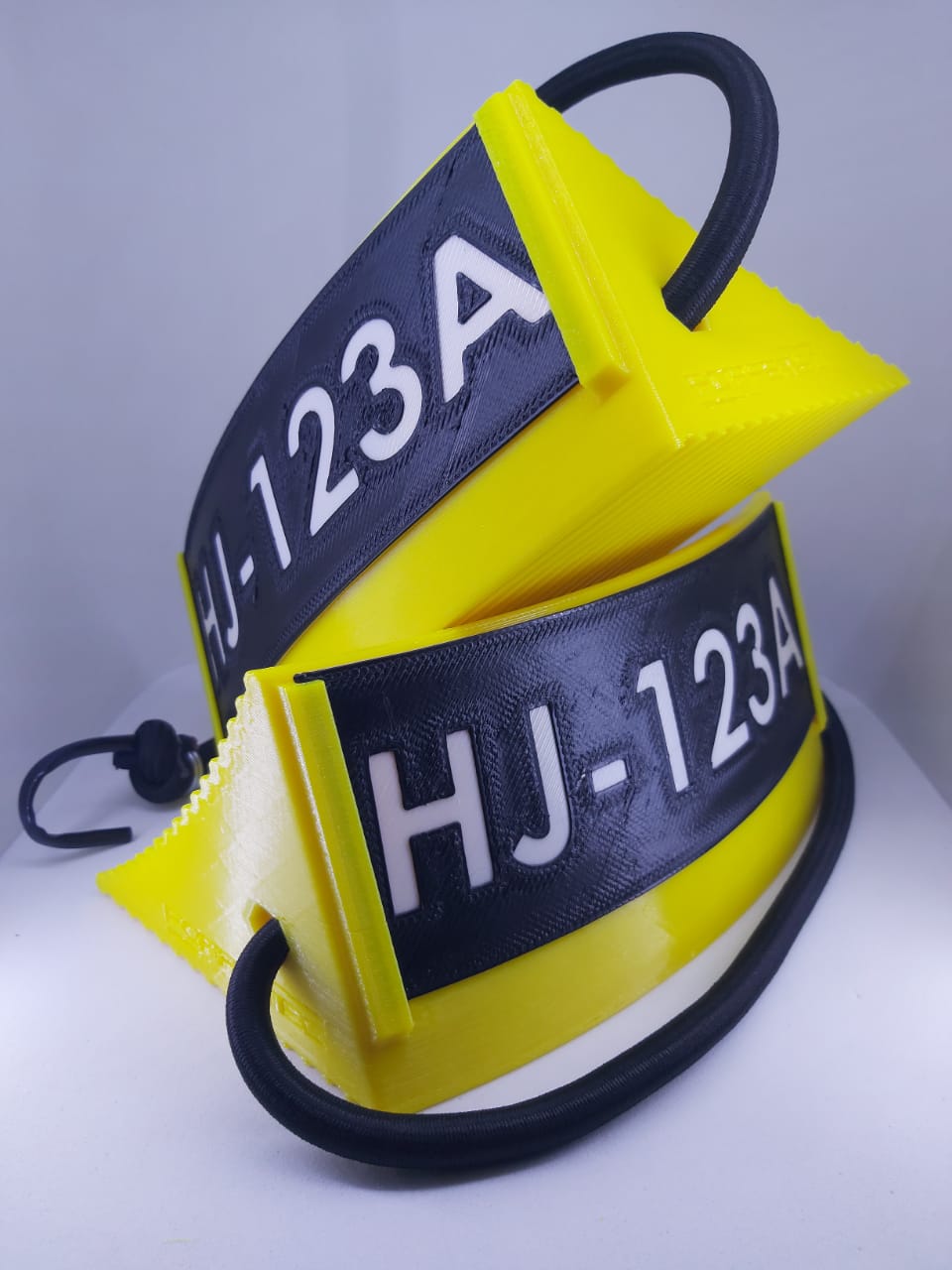 2 sets de 2 piezas fabricadas en material PETG. Están unidas por una cuerda elástica con ganchos metálicos. Cada una cuenta con placa personalizable con la matricula del avión.